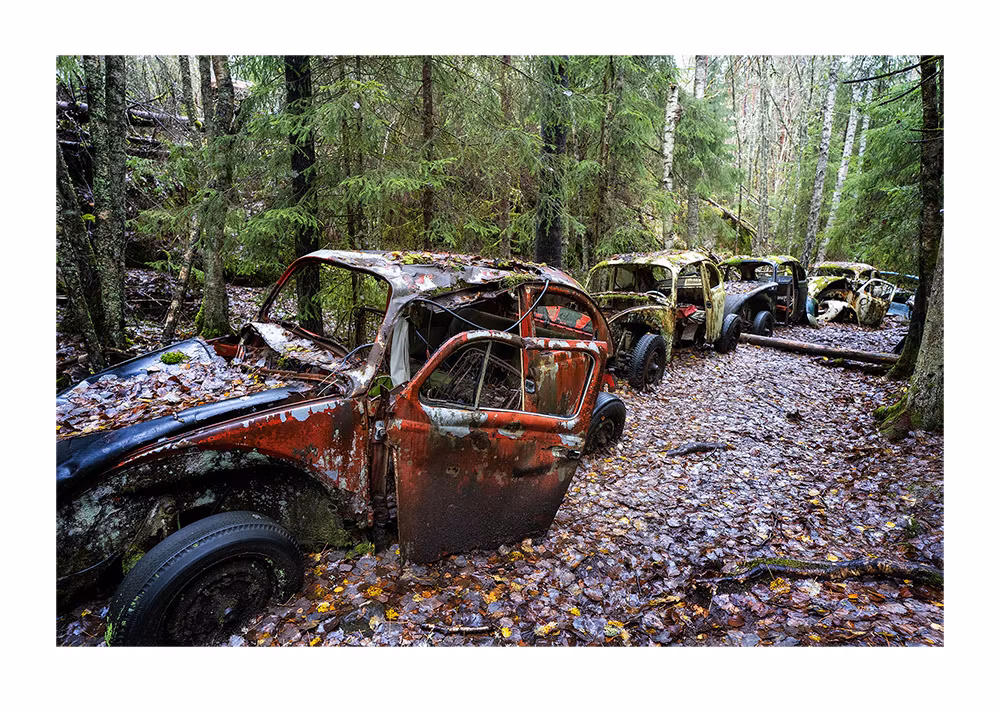 Row of VW in a scrapyard, Sweden